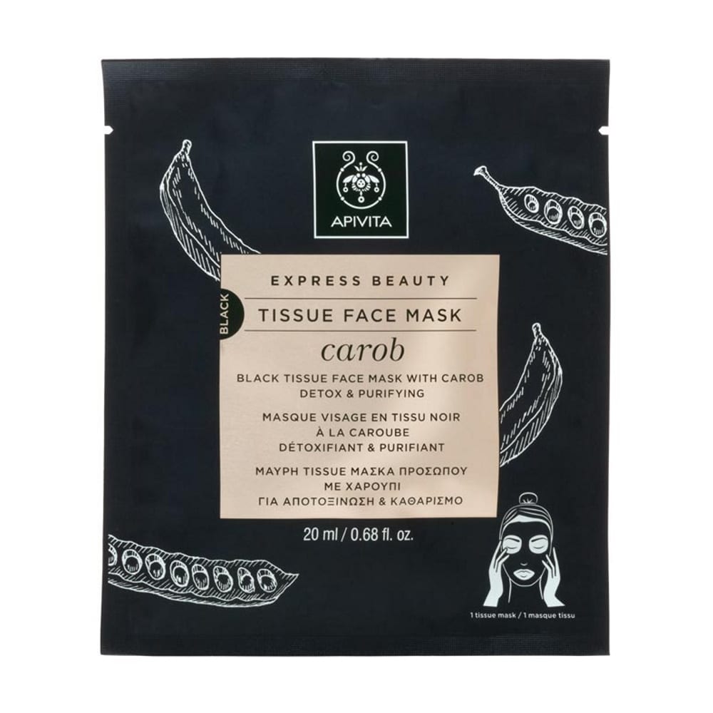 Η ΕΧPRESS BEAUTY μάσκα με χαρούπι, είναι μια μαύρη υφασμάτινη μάσκα, που αποτελείται από ένα μείγμα ενεργού άνθρακα από βελανίδια,
